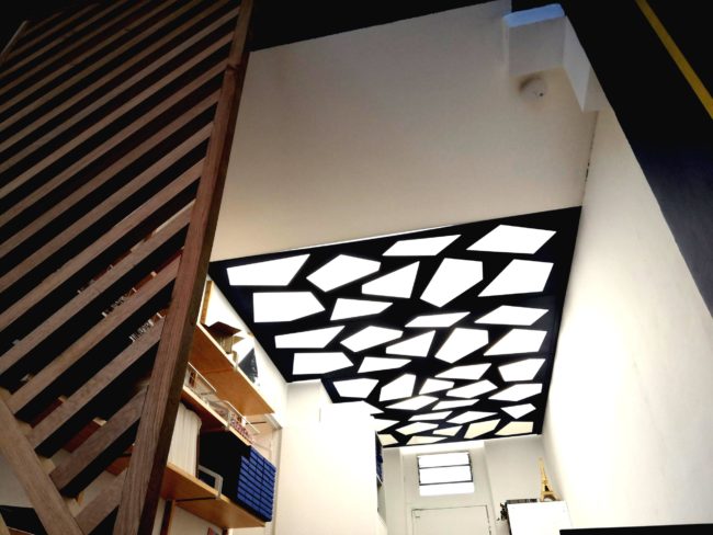 Fabrication sur mesure d’un plafond suspendu en acier découpé au laser. Les formes géométriques de ce faux-plafond en métal donnent un caractère propre à cet espace de travail. Doté d’un plexi diffusant, ce plafond en métal ajouré laisse passer une lumière diffuse et homogène dans ce bureau. Ce type de plafond en acier perforé peut…